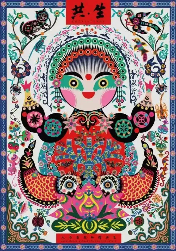 《共·生》以“万物互联、和谐共生”为核心创作理念,聚焦全球化语境下自然与人类文明的交融关系,构建了一套兼具美学张力与哲学思辨的视觉系统。作品以库淑兰剪纸的色彩体系与构图语言为基础,结合当代设计手法,构建了一套兼具文化传承与时代审美的视觉系统